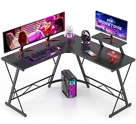 Mr IRONSTONE L Shaped Desk, Computer Gaming Desk, Home Corner Desk, Office Writing Workstation with Large Monitor Stand, Space-Saving, Easy to Assemble, Black