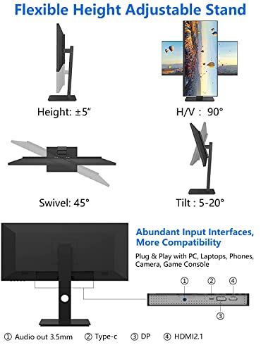 • 【Height & Pivot Adjustable Stand】Height Adjustable, Pivot is adjustable: left/right: 45°, up/down±5″,Forward: 5°, Backward: 20°, Pivot: ±90°, Ergonomic design for daily usage