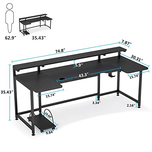 Tribesigns U Shaped Computer Desk with Hutch, 74.8 Inches Gaming Desk with Monitor Stand Shelf, Black Gamer Command Center Workstation Desk for Gaming (Black)